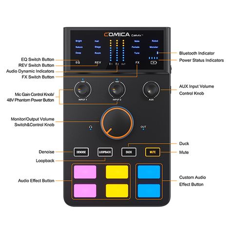 Được trang bị thuật toán khử nhiễu CalMixTM mang tính cách mạng của Comica, C1 lọc tiếng ồn môi trường và mang lại chất lượng âm thanh ở cấp độ phòng thu; Chế độ khử nhiễu hai giai đoạn cũng được thiết kế để hỗ trợ nhiều cảnh ghi không có tiếng ồn.
