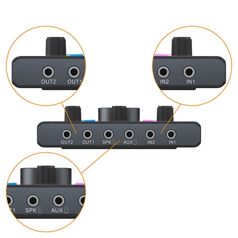 Được trang bị hai núm điều khiển khuếch đại trước riêng biệt, độ lợi lên đến 60dB. Nó tương thích rộng rãi với micrô động trở kháng cao 90%; Hỗ trợ điều chỉnh âm lượng nền, một cú nhấp chuột để chuyển đổi âm lượng màn hình thời gian thực và điều chỉnh độ lợi đầu ra để người dùng trải nghiệm thuận tiện hơn.