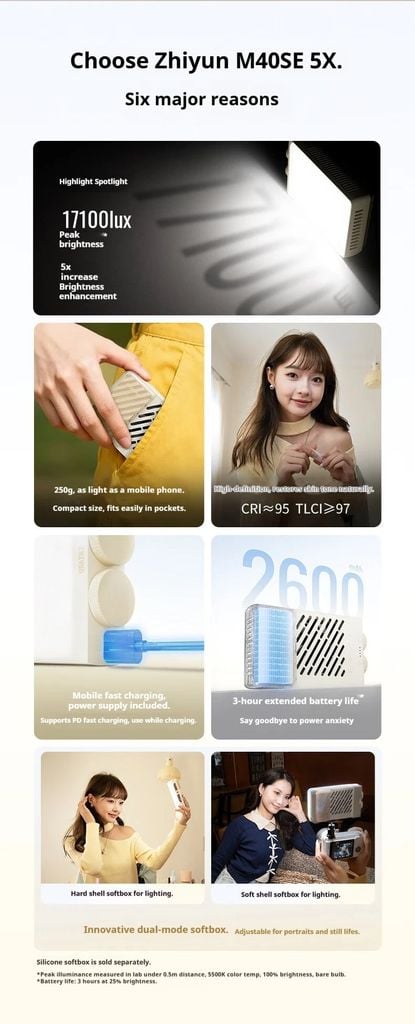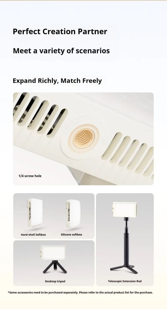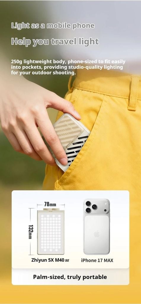 Thân máy nhẹ 250g, kích thước như điện thoại, dễ dàng bỏ vào túi, cung cấp ánh sáng chất lượng studio cho chụp ảnh ngoài trời của bạn.