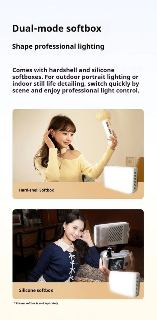 Bao gồm hộp đèn mềm vỏ cứng và vỏ silicon. Để chụp ảnh chân dung ngoài trời hoặc chi tiết tĩnh vật trong nhà, chuyển đổi nhanh chóng theo từng cảnh và tận hưởng khả năng kiểm soát ánh sáng chuyên nghiệp.