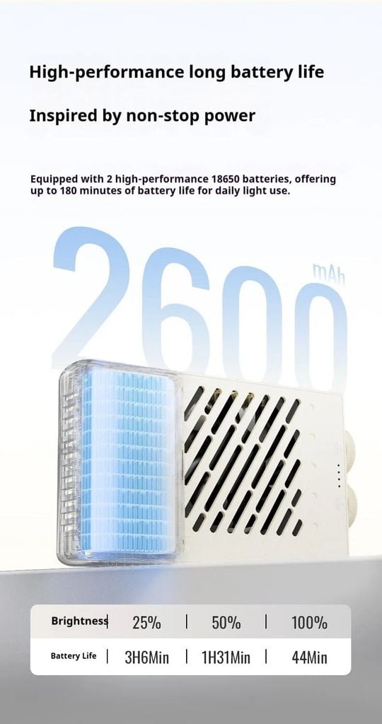 Được trang bị 2 pin 18650 hiệu năng cao, cung cấp thời lượng pin lên đến 180 phút cho việc sử dụng ánh sáng hàng ngày.