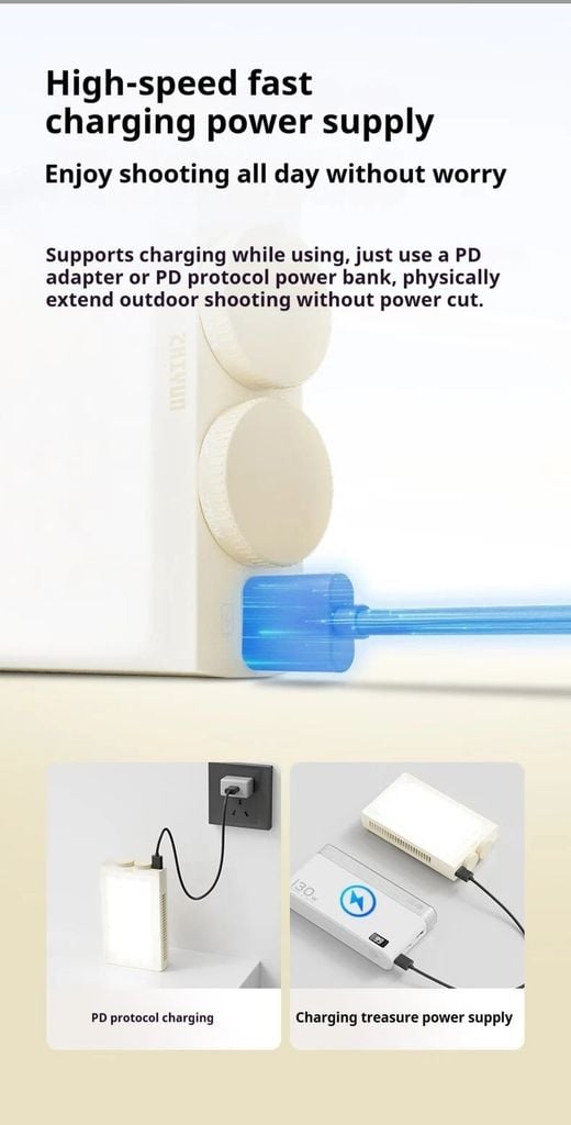 Hỗ trợ sạc trong khi sử dụng, chỉ cần dùng bộ chuyển đổi PD hoặc pin dự phòng giao thức PD, giúp bạn kéo dài thời gian chụp ảnh ngoài trời mà không bị gián đoạn nguồn điện.