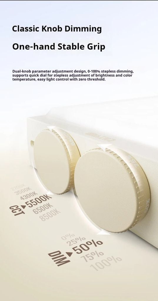 Thiết kế điều chỉnh thông số bằng hai núm xoay, điều chỉnh độ sáng vô cấp từ 0-100%, hỗ trợ xoay nhanh để điều chỉnh độ sáng và nhiệt độ màu vô cấp, dễ dàng điều khiển ánh sáng với ngưỡng bằng không.