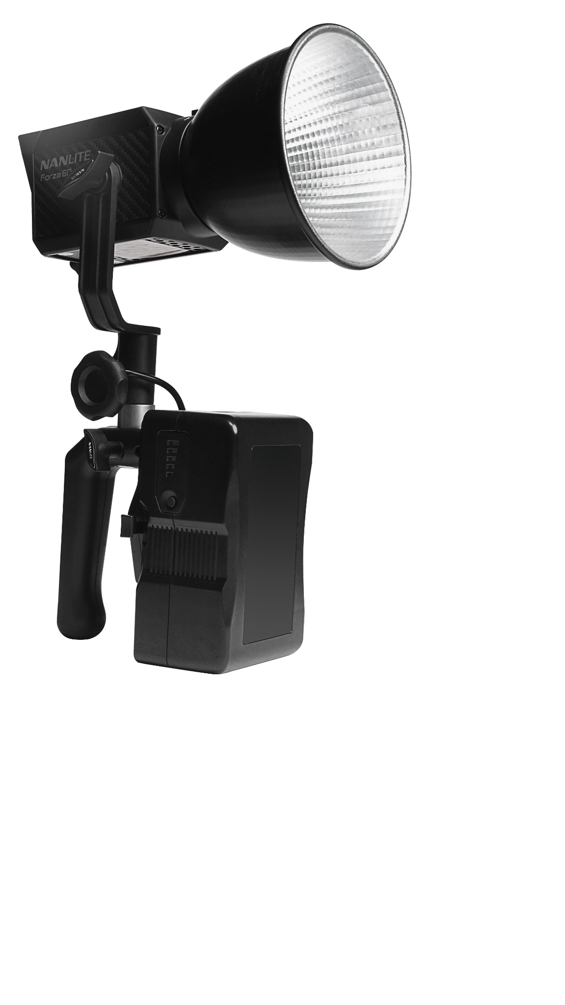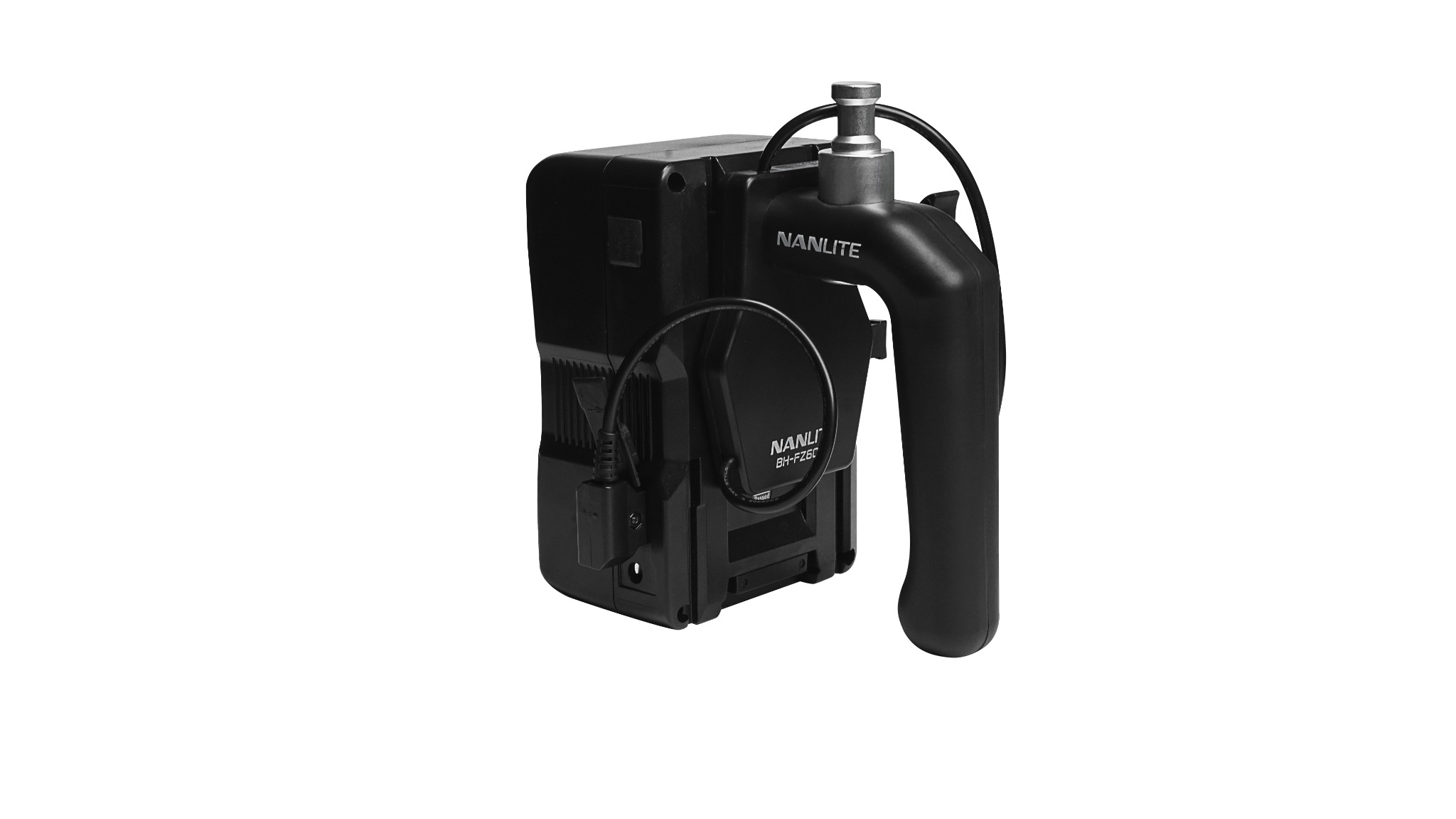Tay cầm pin Nanlite BH-FZ60-V V-Mount. Thiết kế tay cầm tiện dụng cho Forza 60, Forza 60B, Forza 60 II, Forza 60B II và Forza 60C, cùng thời lượng pin khoảng 100 phút không dây ở độ sáng 100% khi được trang bị pin V-Mount 14.8V. Tay cầm này cũng có ngàm thu tín hiệu 5/8" tiêu chuẩn để gắn trực tiếp lên bất kỳ chân đèn tiêu chuẩn nào.