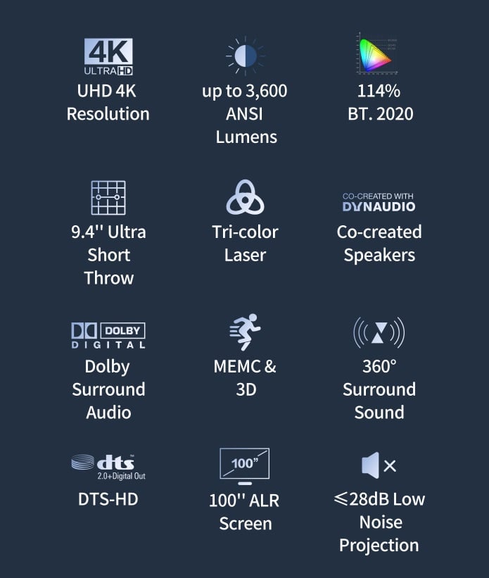 - Laser ba màu | BT.2020 114%: Vượt 159% tiêu chuẩn màu của IMAX. Mở khóa trải nghiệm rạp hát tại nhà cao cấp.