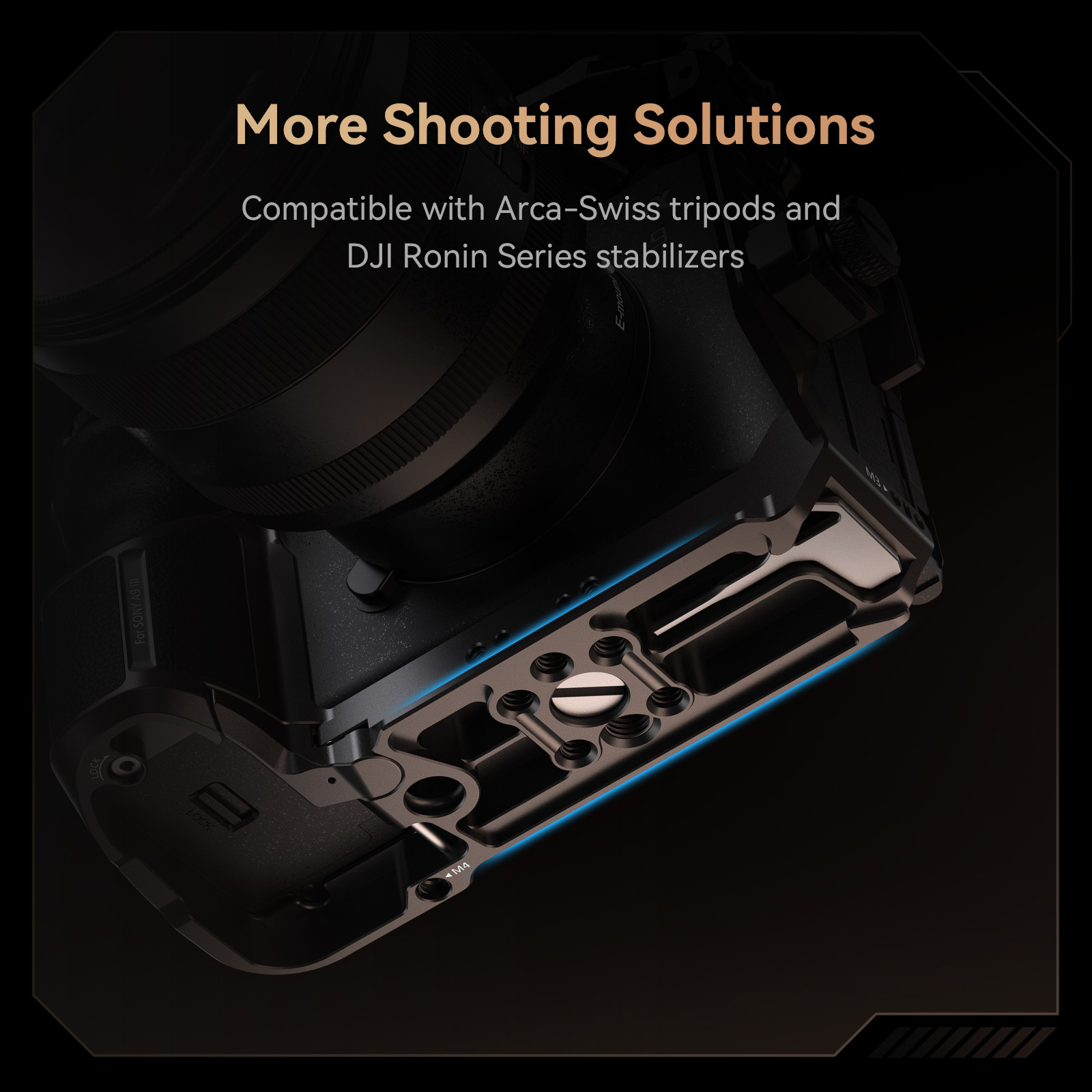 5. Tấm tháo lắp nhanh Arca-Swiss tích hợp để chuyển đổi nhanh giữa chế độ chụp cầm tay, chân máy hoặc gimbal (DJI RS 2 / RSC 2 / RS 3 / RS 3 Pro).