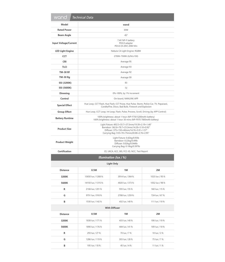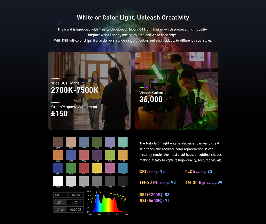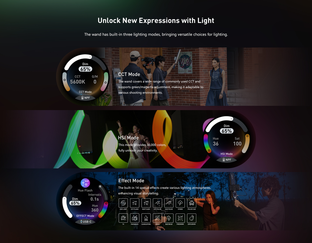 Các tính năng tiện dụng của cây đèn Nanlite Wand cho phép bạn điều chỉnh độ sáng từ 0 đến 100% với gia số 1%, trong khi bạn có thể đặt nhiệt độ màu từ ấm đến lạnh (2700 đến 7500K) hoặc tìm tới 36.000 màu khác nhau, 14 hiệu ứng sáng tạo và tám hiệu ứng nhóm. Chọn từ nhiều hiệu ứng đầy màu sắc khác nhau để dễ dàng đạt được kết quả và mô phỏng ánh sáng ấn tượng. Các hiệu ứng bao gồm vòng lặp màu sắc, đèn flash CCT, đèn flash màu sắc, xung CCT, xung màu sắc, bão, xe cảnh sát, TV, v.v.