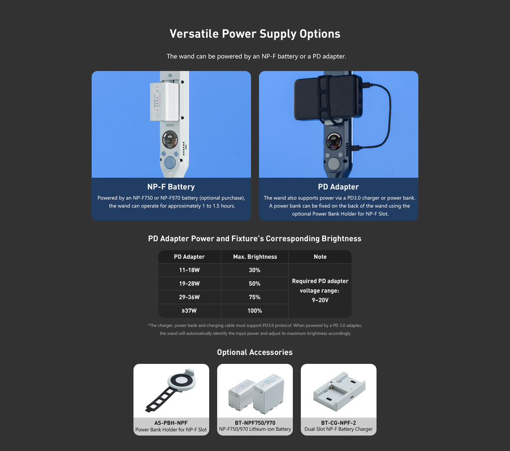 Đổi pin nhanh chóng và dễ dàng trong các buổi chụp dài hơn. Đèn chạy bằng pin NP-F tùy chọn hoặc bạn có thể sử dụng pin dự phòng hoặc bộ sạc PD 3.0 bên ngoài. Các tùy chọn này đảm bảo bạn có thể vận hành Nanlite Wand ở bất kỳ vị trí nào. Nanlite cung cấp giá đỡ pin dự phòng tùy chọn để dễ dàng đặt ở mặt sau của cây đèn.
