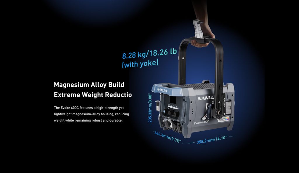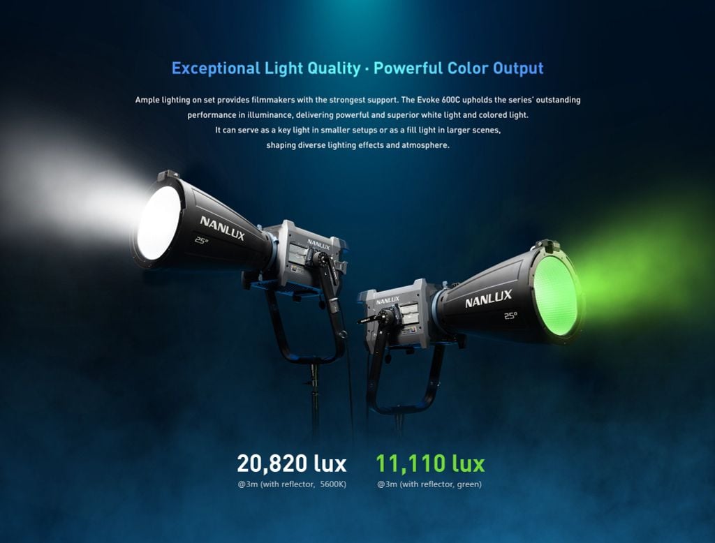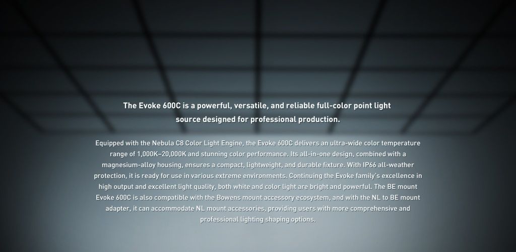 Ánh sáng dồi dào trên trường quay mang đến cho các nhà làm phim sự hỗ trợ mạnh mẽ nhất. Evoke 600C duy trì hiệu suất chiếu sáng vượt trội của dòng phim, mang đến ánh sáng trắng và ánh sáng màu mạnh mẽ và vượt trội.