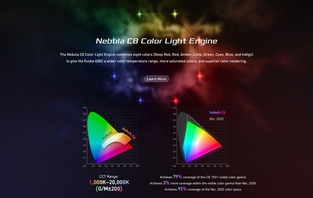 Công nghệ đèn nền Nebula C8 Color Light Engine kết hợp tám màu (Đỏ thẫm, Đỏ, Hổ phách, Vôi, Xanh lục, Lục lam, Xanh lam và Chàm) để mang đến cho Evoke 600C dải nhiệt độ màu rộng hơn, màu sắc bão hòa hơn và khả năng hiển thị màu vượt trội.