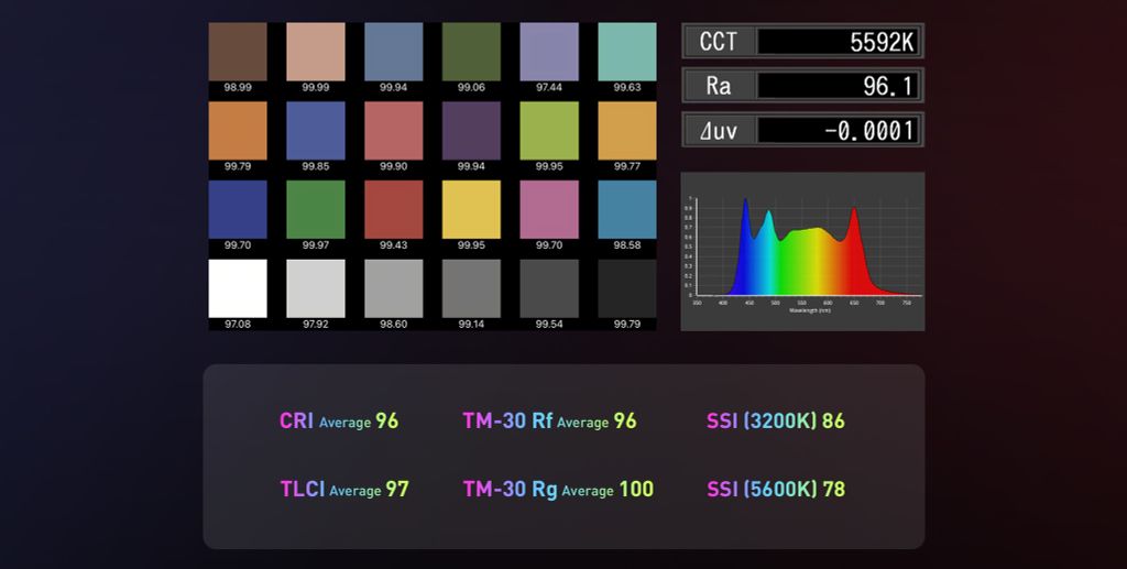 Dải CCT cực rộng từ 1.000K đến 20.000K, và hỗ trợ điều chỉnh xanh lá/đỏ tươi +200
