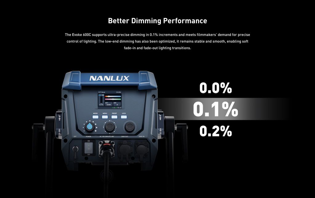 Evoke 600C hỗ trợ làm mờ cực kỳ chính xác với mức tăng 0,1% và đáp ứng nhu cầu kiểm soát ánh sáng chính xác của các nhà làm phim. Độ mờ ở dải tần thấp cũng được tối ưu hóa, duy trì sự ổn định và mượt mà, cho phép chuyển đổi ánh sáng mờ dần (fade-in) và mờ dần (fade-out) một cách nhẹ nhàng.