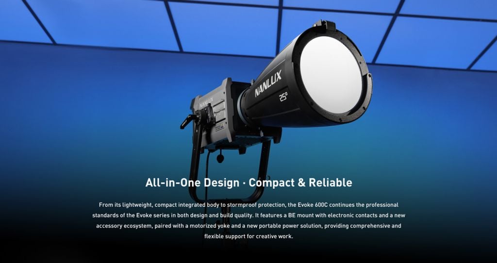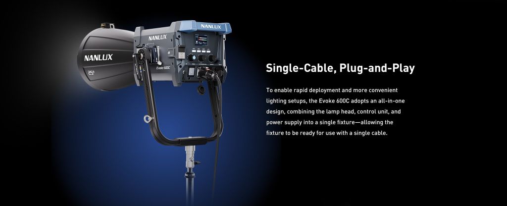 Để triển khai nhanh chóng và thiết lập chiếu sáng thuận tiện hơn, Evoke 600C áp dụng thiết kế tất cả trong một, kết hợp đầu đèn, bộ điều khiển và nguồn điện thành một thiết bị duy nhất - cho phép thiết bị sẵn sàng sử dụng chỉ với một dây cáp duy nhất.