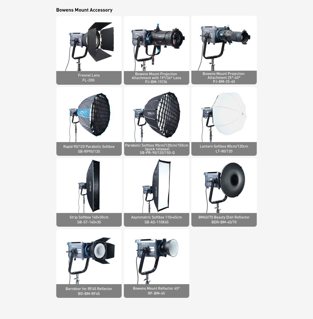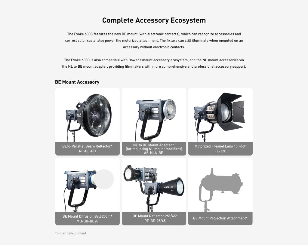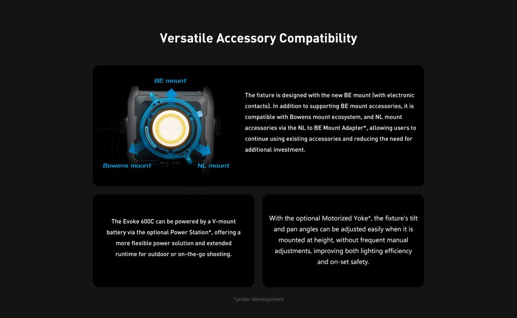 Evoke 600C cũng tương thích với hệ sinh thái phụ kiện ngàm Bowens và phụ kiện ngàm NL thông qua bộ chuyển đổi ngàm NL sang BE, mang đến cho các nhà làm phim sự hỗ trợ phụ kiện toàn diện và chuyên nghiệp hơn.