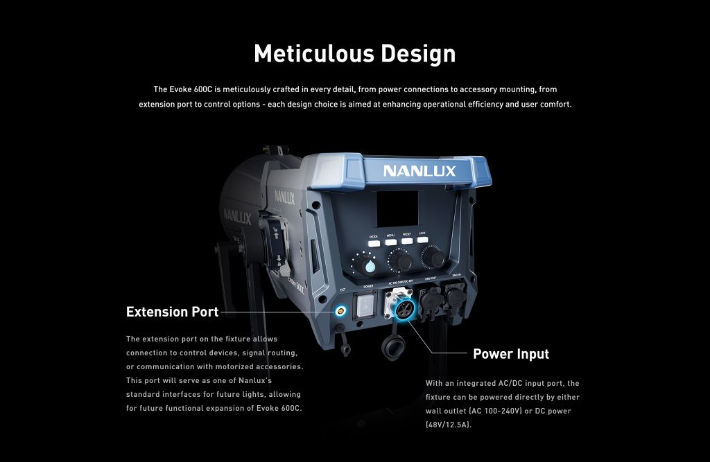 Cổng mở rộng trên đèn cho phép kết nối với các thiết bị điều khiển, định tuyến tín hiệu hoặc giao tiếp với các phụ kiện cơ giới. Cổng này sẽ đóng vai trò là một trong những giao diện tiêu chuẩn của Nanlux cho các loại đèn trong tương lai, cho phép mở rộng chức năng của Evoke 600C trong tương lai.