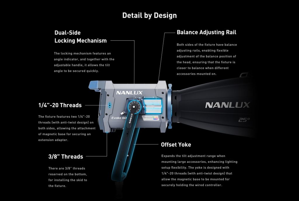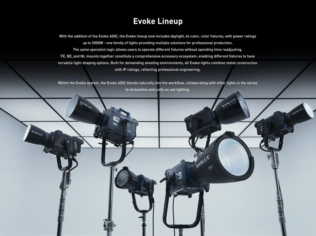 Nguyên lý vận hành tương tự cho phép người dùng vận hành nhiều loại đèn khác nhau mà không mất thời gian điều chỉnh lại. Các ngàm FE, BE và NL kết hợp tạo nên một hệ sinh thái phụ kiện toàn diện, cho phép các loại đèn khác nhau có nhiều lựa chọn định hình ánh sáng đa dạng. Được thiết kế cho các môi trường quay phim khắc nghiệt, tất cả đèn Evoke đều kết hợp cấu trúc kim loại với chỉ số IP, thể hiện kỹ thuật chuyên nghiệp.