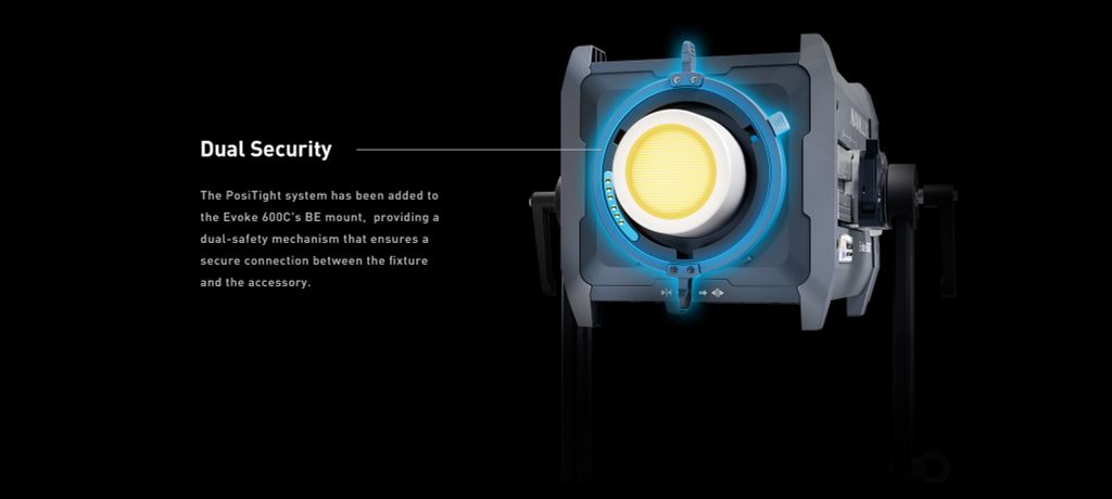 Hệ thống PosiTight đã được bổ sung vào giá đỡ BE của Evoke 600C, cung cấp cơ chế an toàn kép đảm bảo kết nối an toàn giữa đèn và phụ kiện.