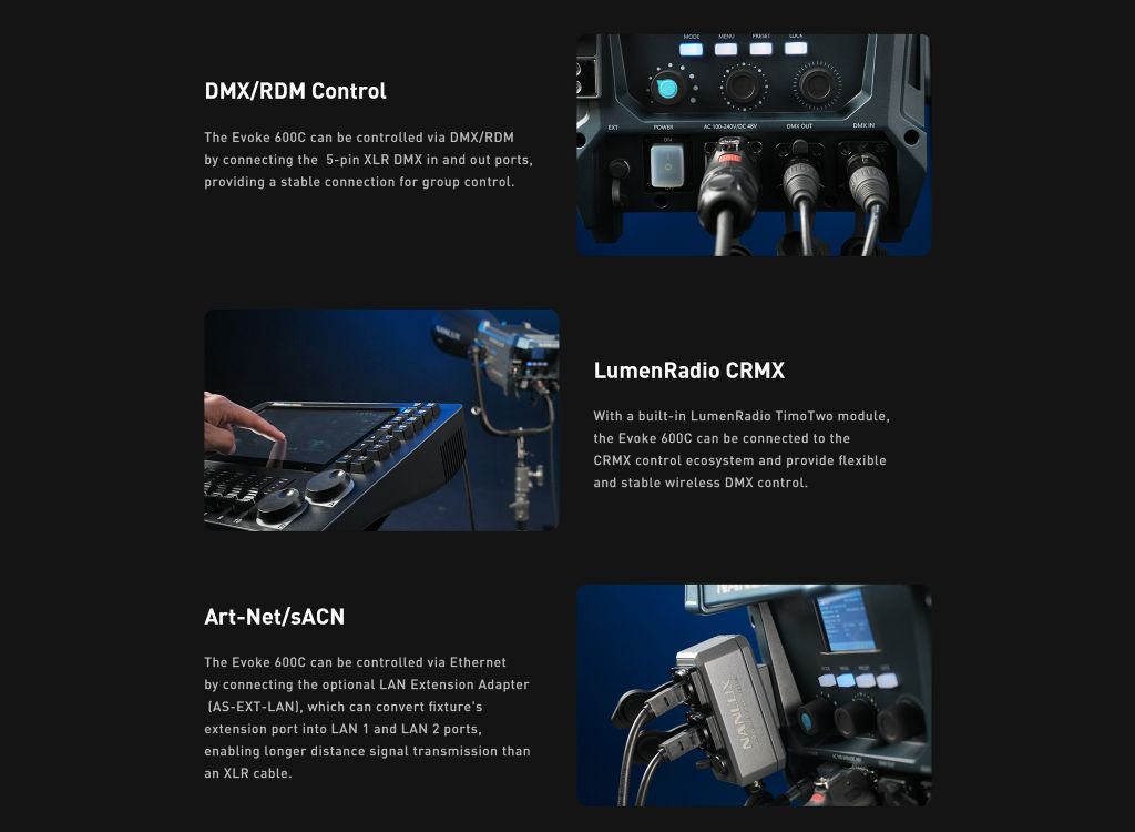 Evoke 600C có thể được kết nối với hệ sinh thái điều khiển CRMX và cung cấp khả năng điều khiển DMX không dây linh hoạt và ổn định.