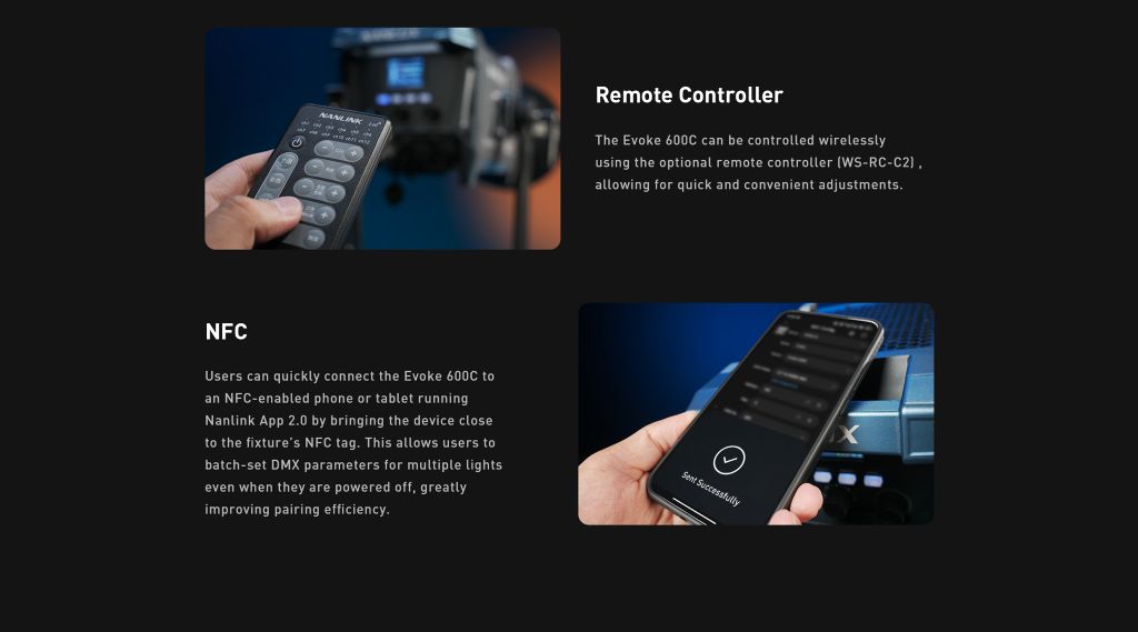Người dùng có thể nhanh chóng kết nối Evoke 600C với điện thoại hoặc máy tính bảng hỗ trợ NFC chạy ứng dụng Nanlink 2.0 bằng cách đặt thiết bị gần thẻ NFC của đèn. Điều này cho phép người dùng thiết lập hàng loạt thông số DMX cho nhiều đèn ngay cả khi đèn đã tắt, cải thiện đáng kể hiệu quả ghép nối.