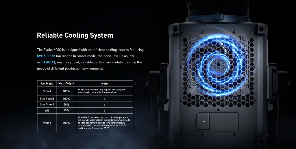 Evoke 600C được trang bị hệ thống làm mát hiệu quả với năm chế độ quạt tích hợp. Ở chế độ Thông minh, độ ồn chỉ