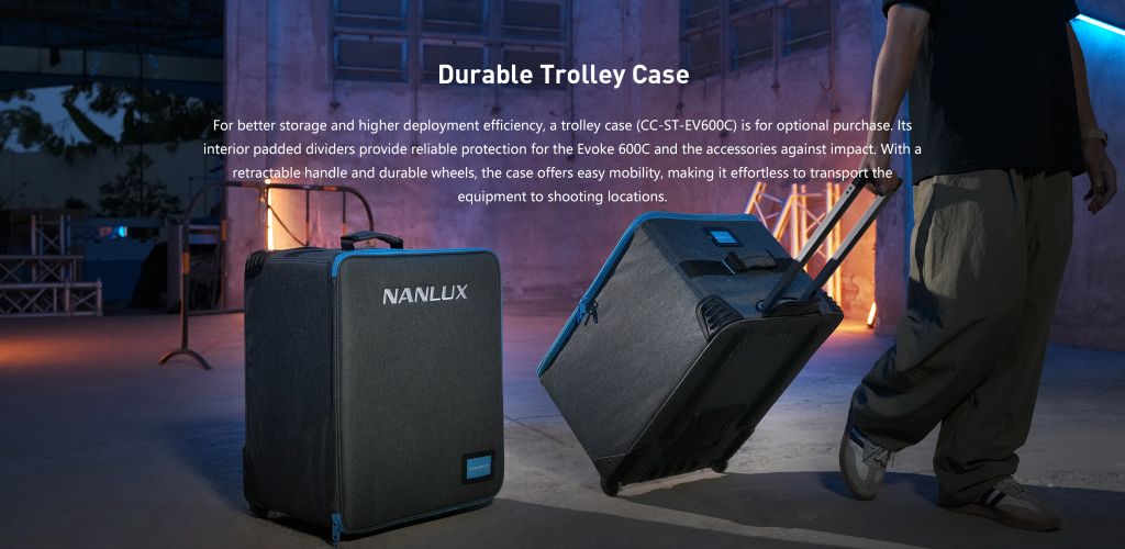 Để bảo quản tốt hơn và nâng cao hiệu quả sử dụng, bạn có thể mua thêm hộp đựng xe đẩy (CC-ST-EV600C). Các ngăn đệm bên trong giúp bảo vệ Evoke 600C và các phụ kiện khỏi va đập đáng tin cậy. Với tay cầm có thể thu gọn và bánh xe bền bỉ, hộp đựng dễ dàng di chuyển, giúp bạn dễ dàng vận chuyển thiết bị đến địa điểm chụp.