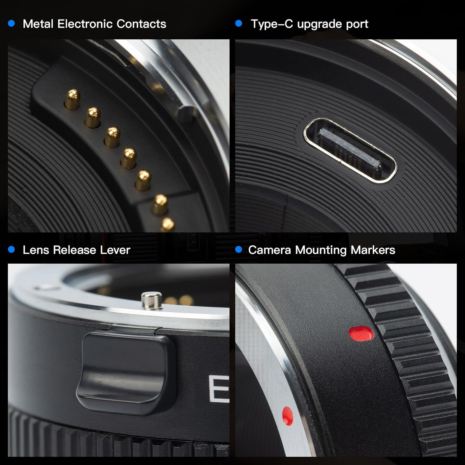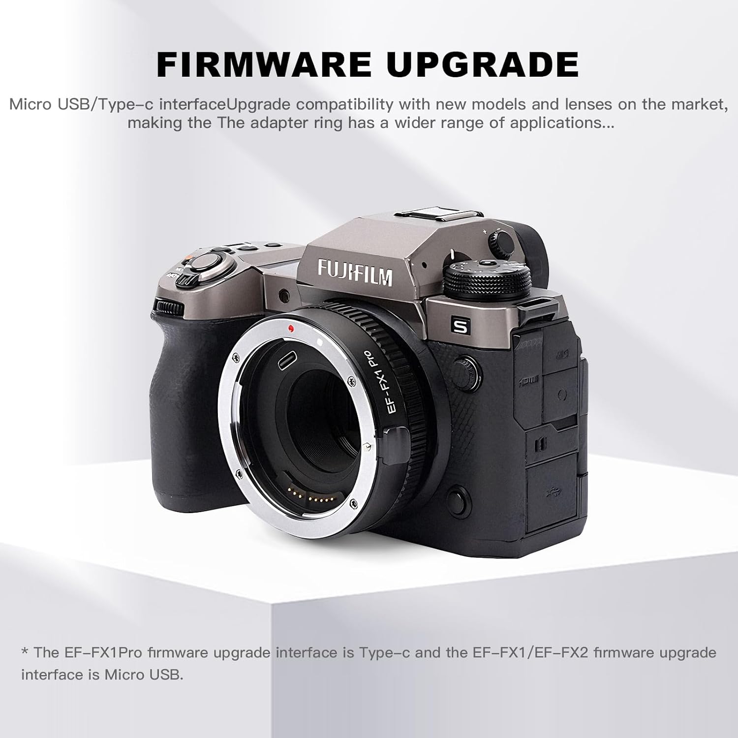- Giao diện Micro USB/Type-C: VILTROX EF-FX1 Pro hỗ trợ nâng cấp chương trình cơ sở tương thích với các mẫu máy và ống kính mới trên thị trường, giúp vòng chuyển đổi được sử dụng rộng rãi hơn.
