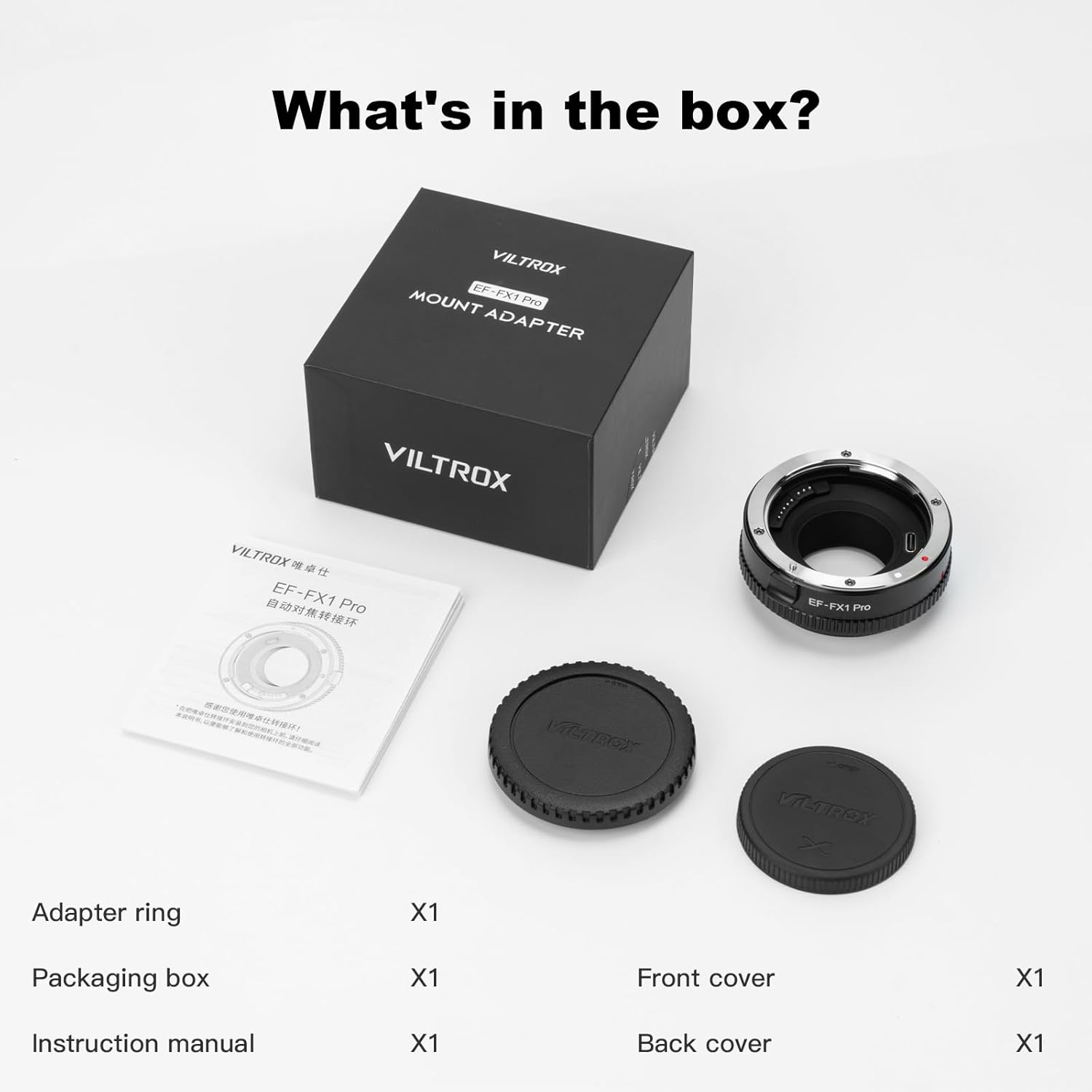 - Khẩu độ tăng, tiêu cự giảm: VILTROX EF-FX1 Pro có cấu trúc quang học tích hợp với 4 nhóm và 4 thành phần, nhân tiêu cự với 0,71 và tăng khẩu độ lên một cấp. - Ví dụ: tiêu cự 50mm (hệ số chuyển đổi cổng X là 1,5); Tiêu cự EF-FX2: 50mm x 1,5 (hệ số chuyển đổi) x 0,71 = 53,25mm; Tiêu cự EF-FX1: 50mm x 1,5 (hệ số chuyển đổi) = 75mm