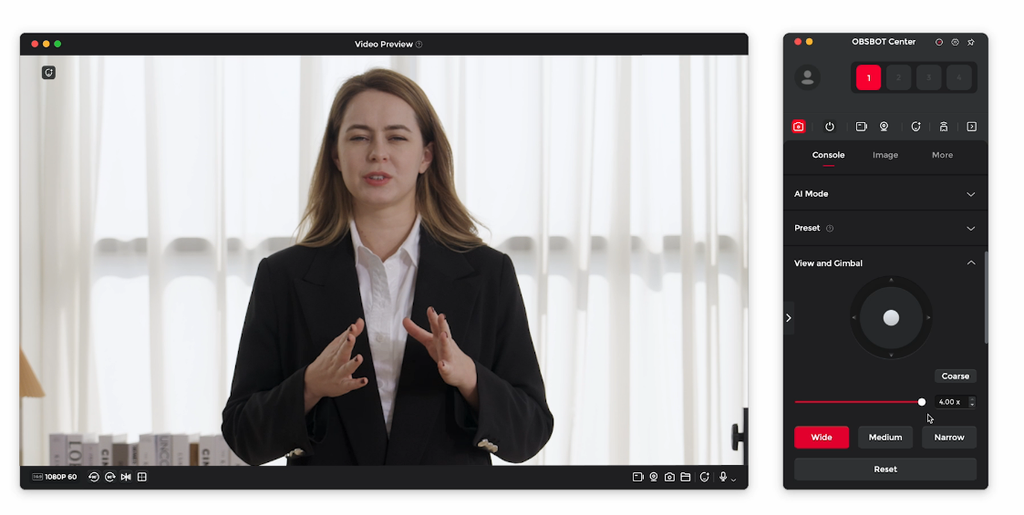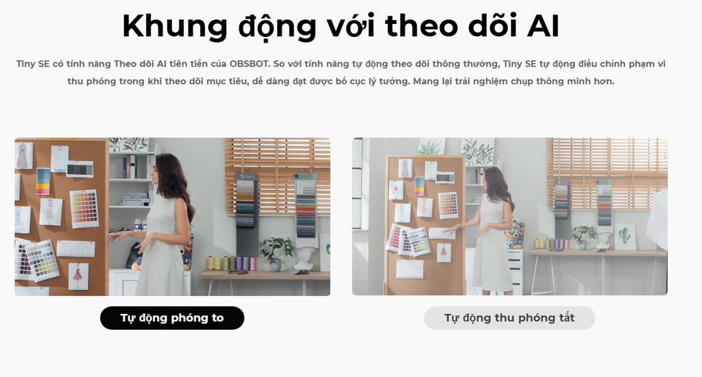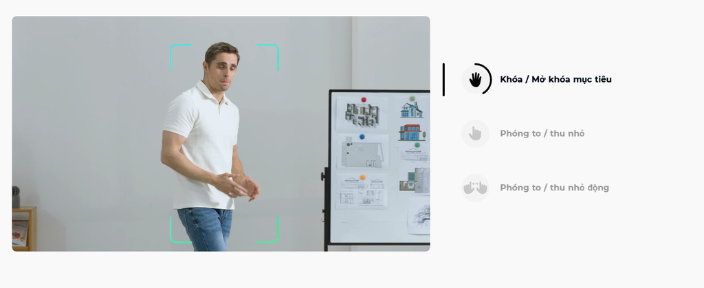 Tiny SE hỗ trợ điều chỉnh phạm vi lấy nét lên đến 4x Zoom kỹ thuật số thông qua Trung tâm OBSBOT, Điều khiển bằng cử chỉ và Điều khiển từ xa thông minh Tiny 2. Cho dù bạn đang trong cuộc họp, phát trực tuyến hay thuyết trình, nó cung cấp khả năng phóng đại linh hoạt để ghi lại chi tiết của đối tượng.