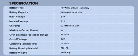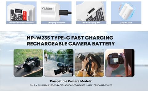 Khả năng tương thích rộng: Những loại pin này tích hợp liền mạch với nhiều mẫu máy ảnh Fujifilm khác nhau, bao gồm X-T5, X-T4, VG-XT4, X-S20, GFX50SII, GFX100S, X-H2 và X-H2S. Cho dù chụp ảnh chuyên nghiệp hay quay video độ nét cao, những loại pin này đều cung cấp nguồn điện ổn định và đáng tin cậy.