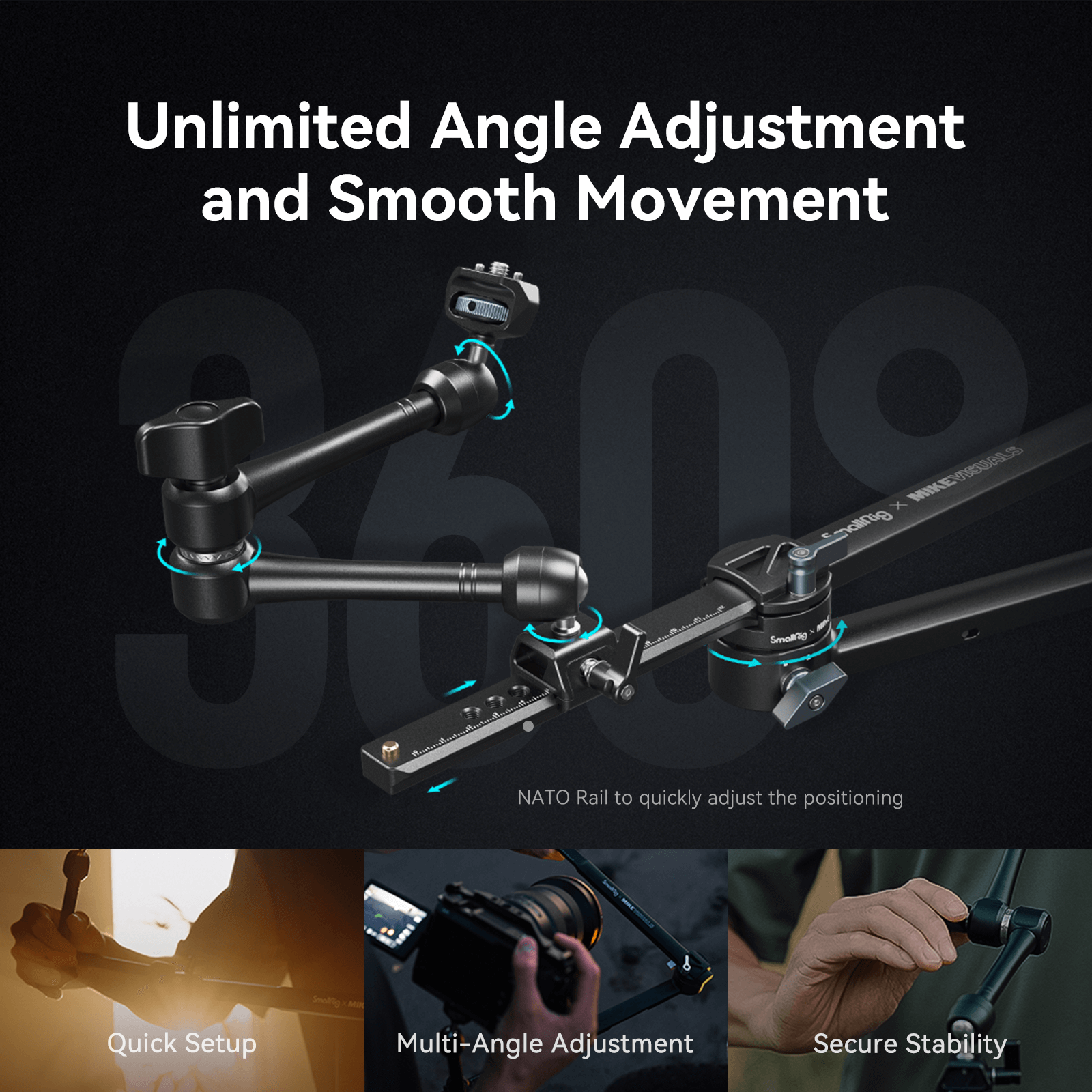 2. Cho phép thiết bị ở cả hai đầu được điều chỉnh tự do 360˚ và cố định, và hai cánh tay hoa thị 11” đi kèm cung cấp khả năng điều chỉnh đa diện hơn
