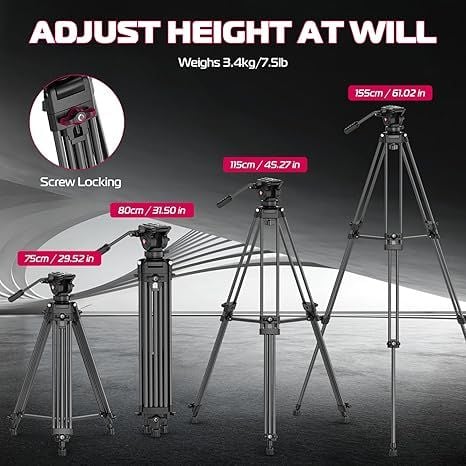 【Chiều cao có thể điều chỉnh】Khóa núm chắc chắn cho phép chúng ta kéo dài và cố định chân một cách thuận tiện và dễ dàng. Sử dụng cơ chế khóa này để điều chỉnh chiều cao của chân máy từ 29,5 inch/75 cm đến 61 inch/155 cm. Gấp chân máy xuống còn 31,5 inch/80 cm, giúp cất giữ và vận chuyển cực kỳ dễ dàng