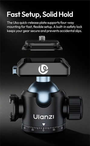 Ulanzi T100 – Đầu Bi Hợp Kim Xoay 360° Cho Chân Máy Ảnh DSLR, Máy Quay & Action Camera. Sản phẩm được trang bị đế tháo lắp nhanh Uka Quick Release, cho phép thao tác gắn – tháo máy ảnh chỉ trong vài giây, giúp bạn tiết kiệm thời gian và bắt trọn mọi khoảnh khắc.