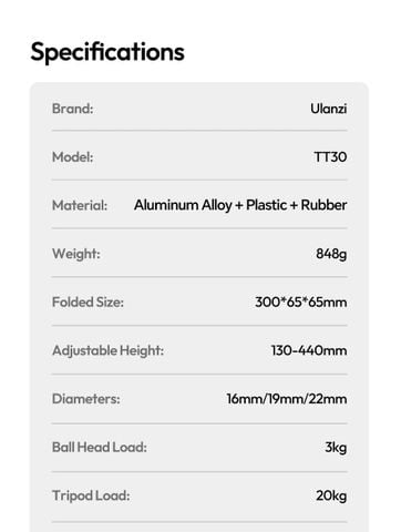 Chân máy du lịch Ulanzi TT30 là một thiết bị đa năng được thiết kế để đáp ứng nhu cầu của cả nhiếp ảnh gia và nhà quay phim. Được làm từ nhôm chất lượng cao, chân máy này đảm bảo độ bền và ổn định, khiến nó trở thành người bạn đồng hành lý tưởng cho các cuộc phiêu lưu chụp ảnh và quay phim của bạn. Thiết kế nhẹ, chỉ 848g, giúp bạn dễ dàng vận chuyển, trong khi chiều dài gấp lại nhỏ gọn là 130mm giúp bạn dễ dàng mang theo trong túi đựng máy ảnh hoặc hành lý.